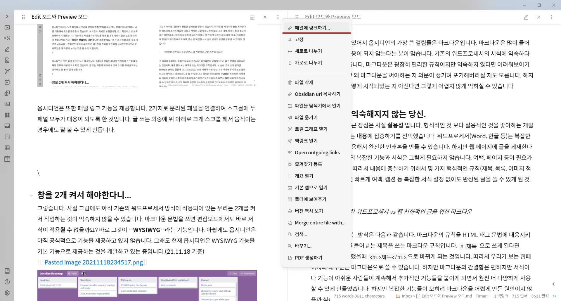 옵시디언은 또한 패널 링크 기능을 제공합니다. 2가지로 분리된 패널을 연결하여 스크롤에 두 패널 모두가 대응이 되도록 한 것입니다. 글 쓰는 와중에 위 아래로 크게 스크롤 해서 움직이는 경우에도 잘 볼 수 있게 만듭니다.