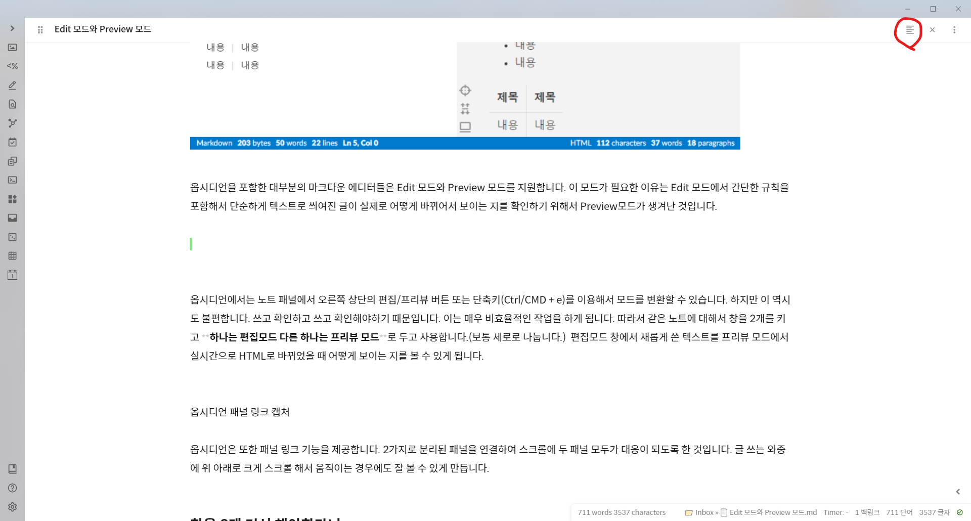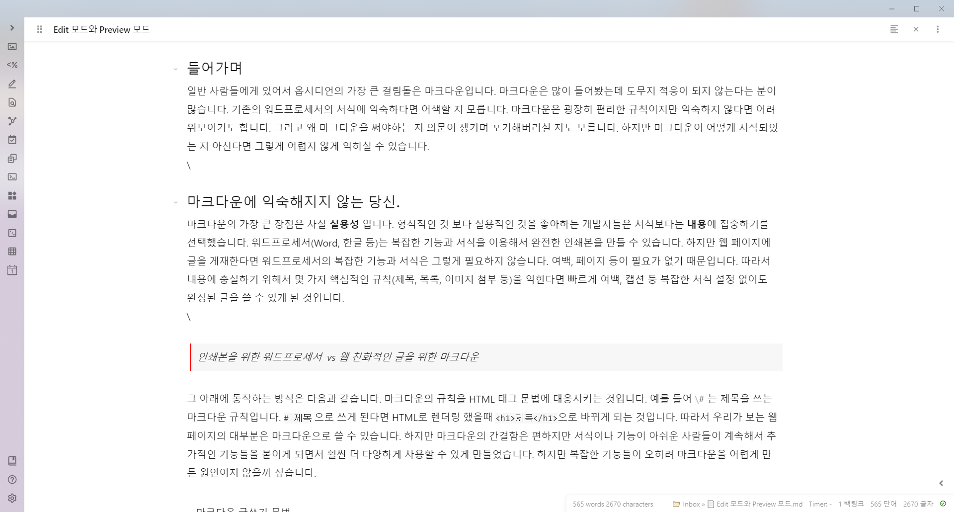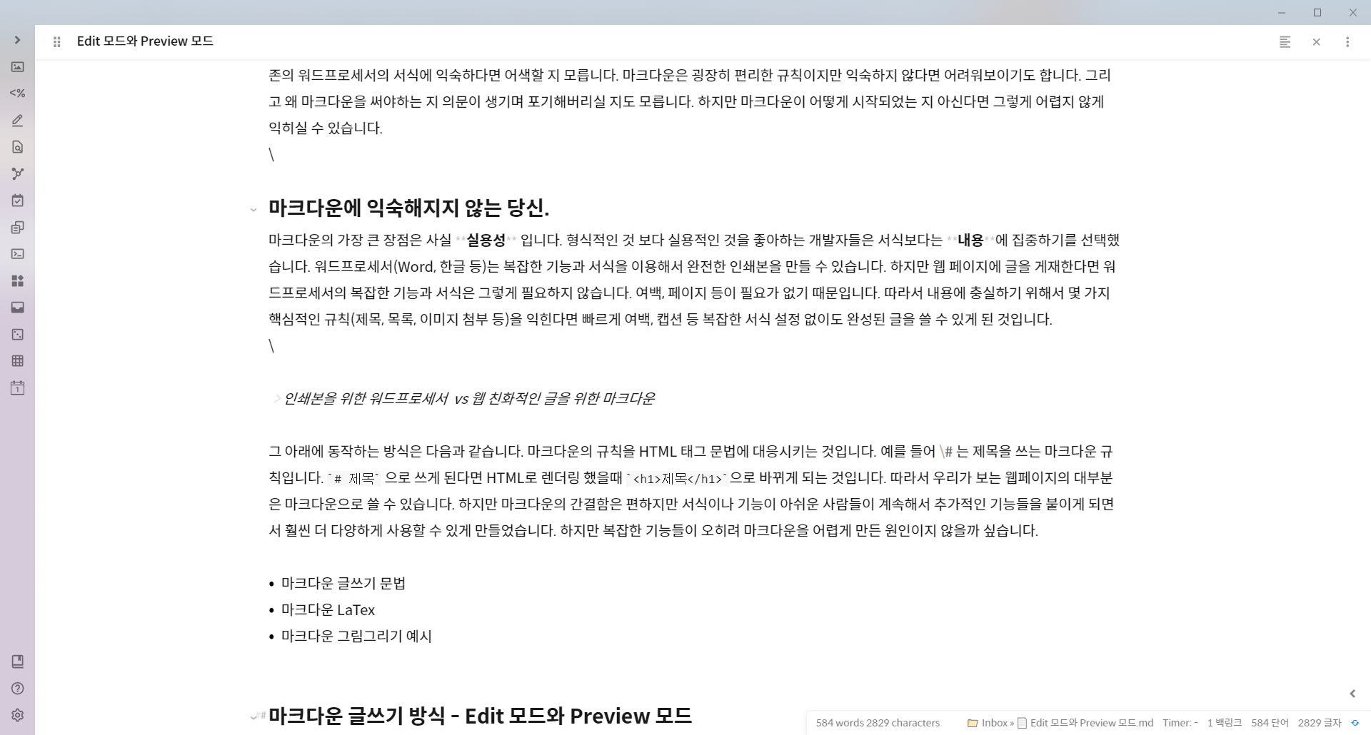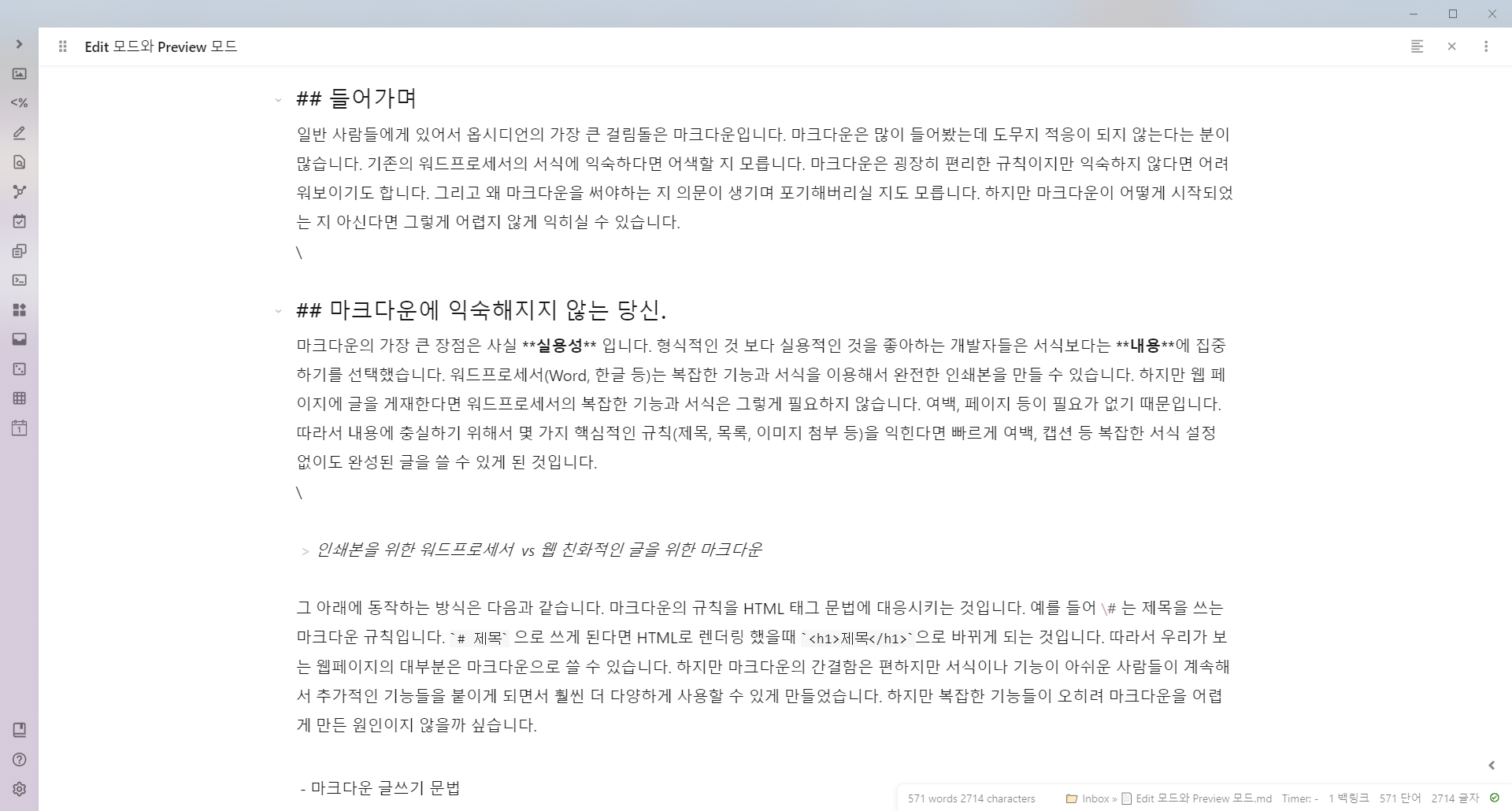옵시디언을 포함한 대부분의 마크다운 에디터들은 Edit 모드와 Preview 모드를 지원합니다. 이 모드가 필요한 이유는 Edit 모드에서 간단한 규칙을 포함해서 단순하게 텍스트로 씌여진 글이 실제로 어떻게 바뀌어서 보이는 지를 확인하기 위해서 Preview모드가 생겨난 것입니다.