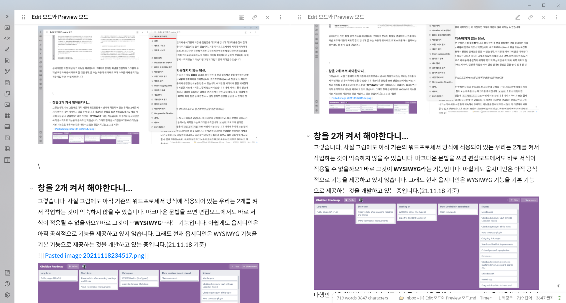 그렇습니다. 사실 그럼에도 아직 기존의 워드프로세서 방식에 적응되어 있는 우리는 2개를 켜서 작업하는 것이 익숙하지 않을 수 있습니다. 마크다운 문법을 쓰면 편집모드에서도 바로 서식이 적용될 수 없을까요? 바로 그것이 WYSIWYG 라는 기능입니다. 아쉽게도 옵시디언은 아직 공식적으로 기능을 제공하고 있지 않습니다. 그래도 현재 옵시디언은 WYSIWYG 기능을 기본 기능으로 제공하는 것을 개발하고 있는 중입니다.(21.11.18 기준)
