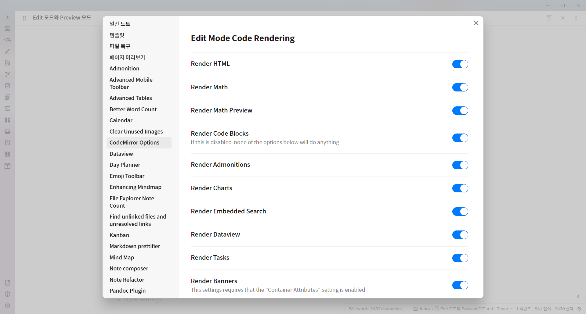 기본적인 마크다운 서식 외에 다양한 추가적인 마크다운 기능(HTML, LaTex, Datview, Admonitions, Tasks 등)을 편집모드에서도 바로 보여줄 수 있도록 합니다. 저는 Tasks와 Dataview 플러그인을 사용하여 이 플러그인을 아주 편리하게 사용하고 있습니다.