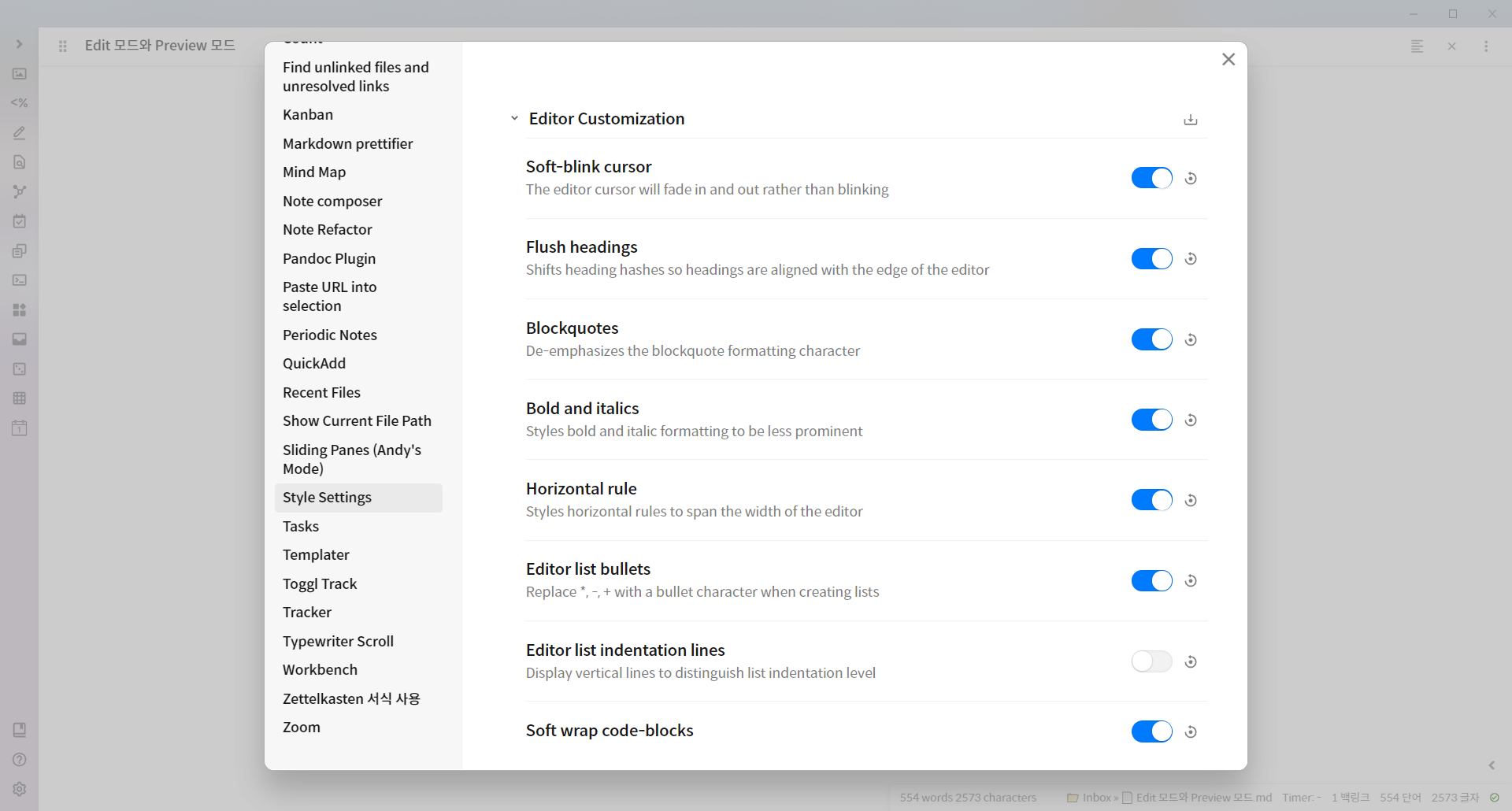 Style Settings 플러그인은 글씨체를 바꾸기 위해서 사용했었습니다. 하지만 Style Settings 내의 Editor Customization 메뉴에서 편집 모드에서 기본적인 마크다운 서식을 바로 변경해줍니다. 특히 헤더(제목), 목록 등을 바로 확인할 수 있어서 편집모드에서의 가독성 및 편집력이 매우 향상 됩니다.