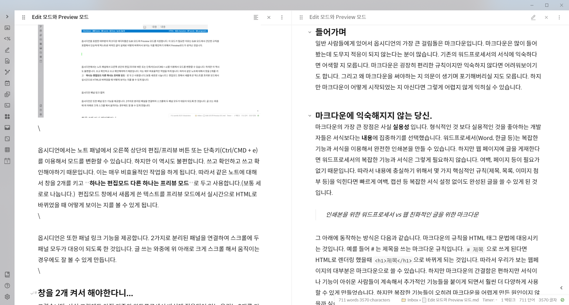 옵시디언에서는 노트 패널에서 오른쪽 상단의 편집/프리뷰 버튼 또는 단축키(Ctrl/CMD + e)를 이용해서 모드를 변환할 수 있습니다. 하지만 이 역시도 불편합니다. 쓰고 확인하고 쓰고 확인해야하기 때문입니다. 이는 매우 비효율적인 작업을 하게 됩니다. 따라서 같은 노트에 대해서 창을 2개를 키고 하나는 편집모드 다른 하나는 프리뷰 모드로 두고 사용합니다.(보통 세로로 나눕니다.) 편집모드 창에서 새롭게 쓴 텍스트를 프리뷰 모드에서 실시간으로 HTML로 바뀌었을 때 어떻게 보이는 지를 볼 수 있게 됩니다.