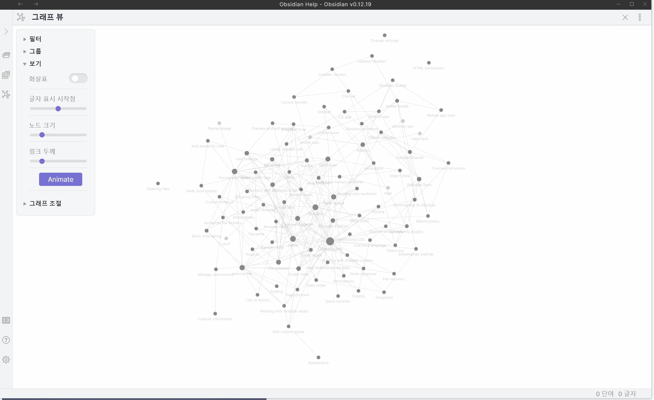 그래프의 모양을 변경합니다. 화살표, 글자를 표시하는 시작점, 확대레벨 정도, 노드 크기, 링크 두께를 슬라이드로 설정할 수 있습니다. 글자표시 시작점은 작으면 작을수록 그래프를 조그만 확대해도 노드 밑에 노트의 제목이 보이게 됩니다.
