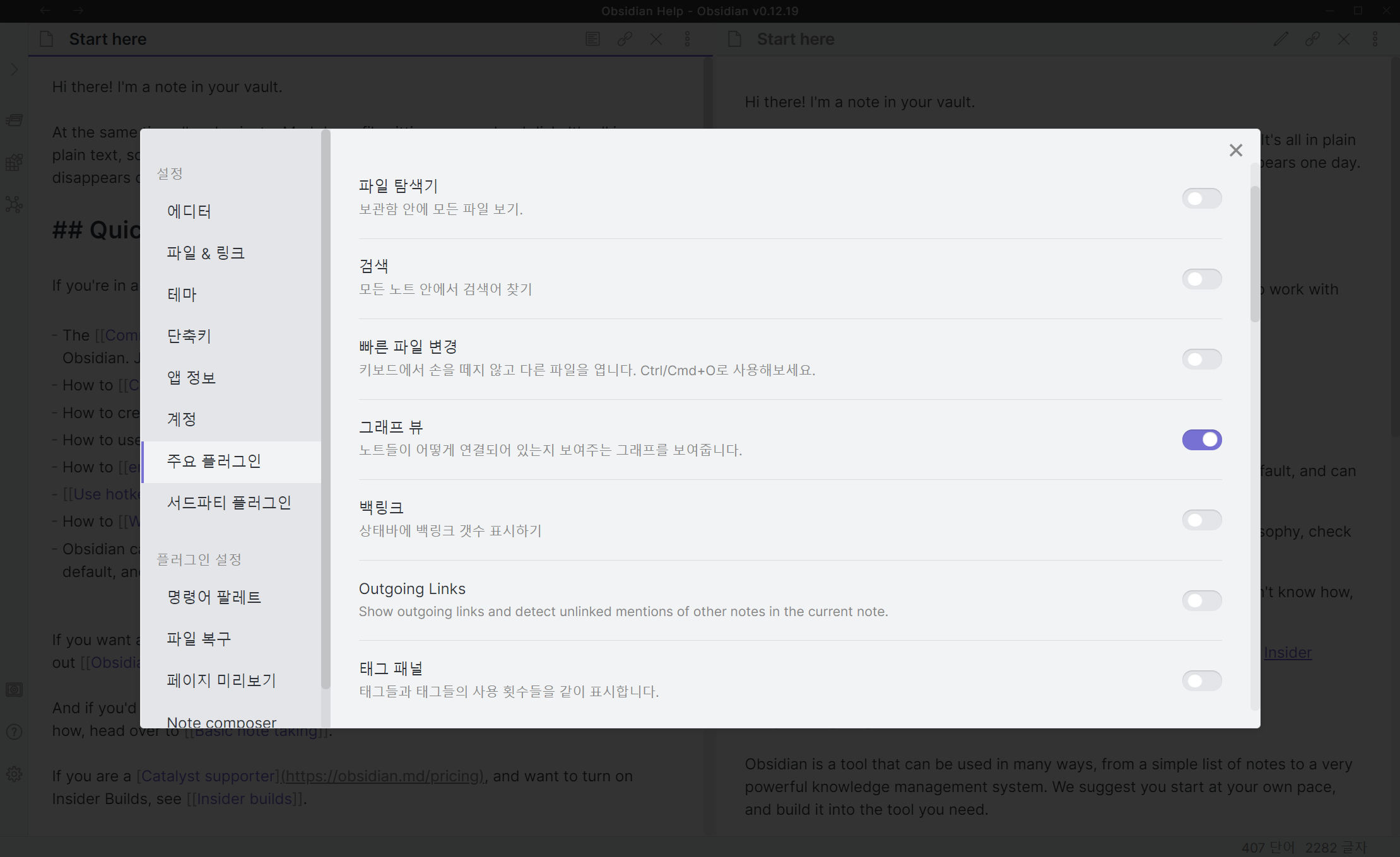 설정 - 주요 플러그인에서 활성화를 시킬 수 있으며, 왼쪽의 리본바에서 그래프뷰 아이콘을 클릭하거나 단축키 Ctrl/Cmd + G로 그래프 뷰를 열 수 있습니다.