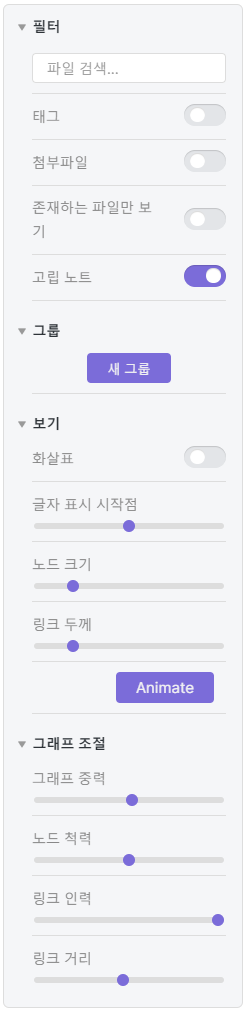 필터란 검색을 시각화하는 것과 같습니다. 앞서 검색에서 설명한 검색 옵션을 그대로 사용할 수 있습니다. 또한 태그, 첨부파일 들을 하나의 점으로 표현할 것인지 또는 존재하는 파일만 볼 것인지, 고립 노트들도 시각화할 것인지 선택할 수 있습니다.