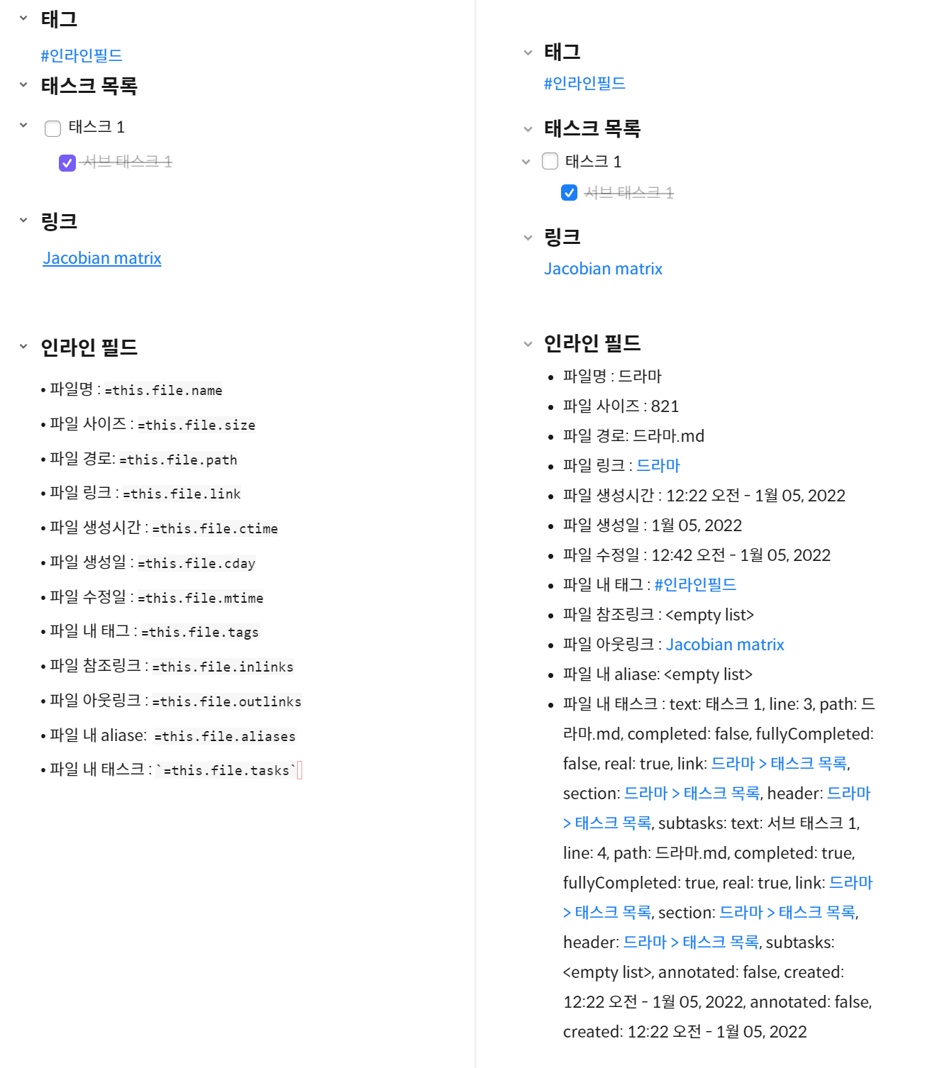 즉, 태스크 이름, 태스크가 포함된 노트의 위치 등등이 있으며 사용자가 태스크 생성일, 마감일, 완료일 같은 것을 추가로 인라인 필드(Inline Fields) 어노테이션 방식으로 넣어주면 더 많은 정보를 추후에 조회할 때 조건문으로 넣어서 가져올 수 있게 됩니다.