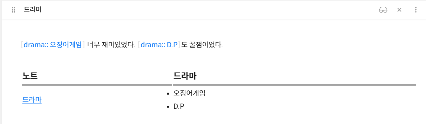 노트의 중간에 drama:: 오징어게임 이렇게 적으면 drama에 대한 정보를 데이터뷰에서 볼 수 있는 것입니다. 이는 프론트매터에 `drama: 오징어게임` 으로 적는 것과 같은 것입니다. 좀 더 자연스럽게 적기 위한 것이고 문장에 여러 개의 인라인필드를 사용하고 싶다면 대괄호를 이용하면 됩니다.