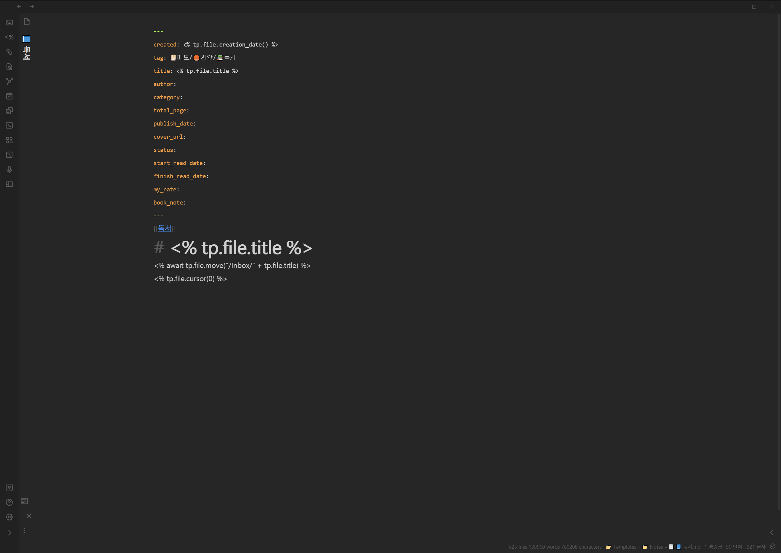 - title - 책 제목을 적습니다. 노트를 새롭게 만들 때 파일의 이름을 적고 템플레이터 플러그인을 적용하면 자동으로 입력됩니다.