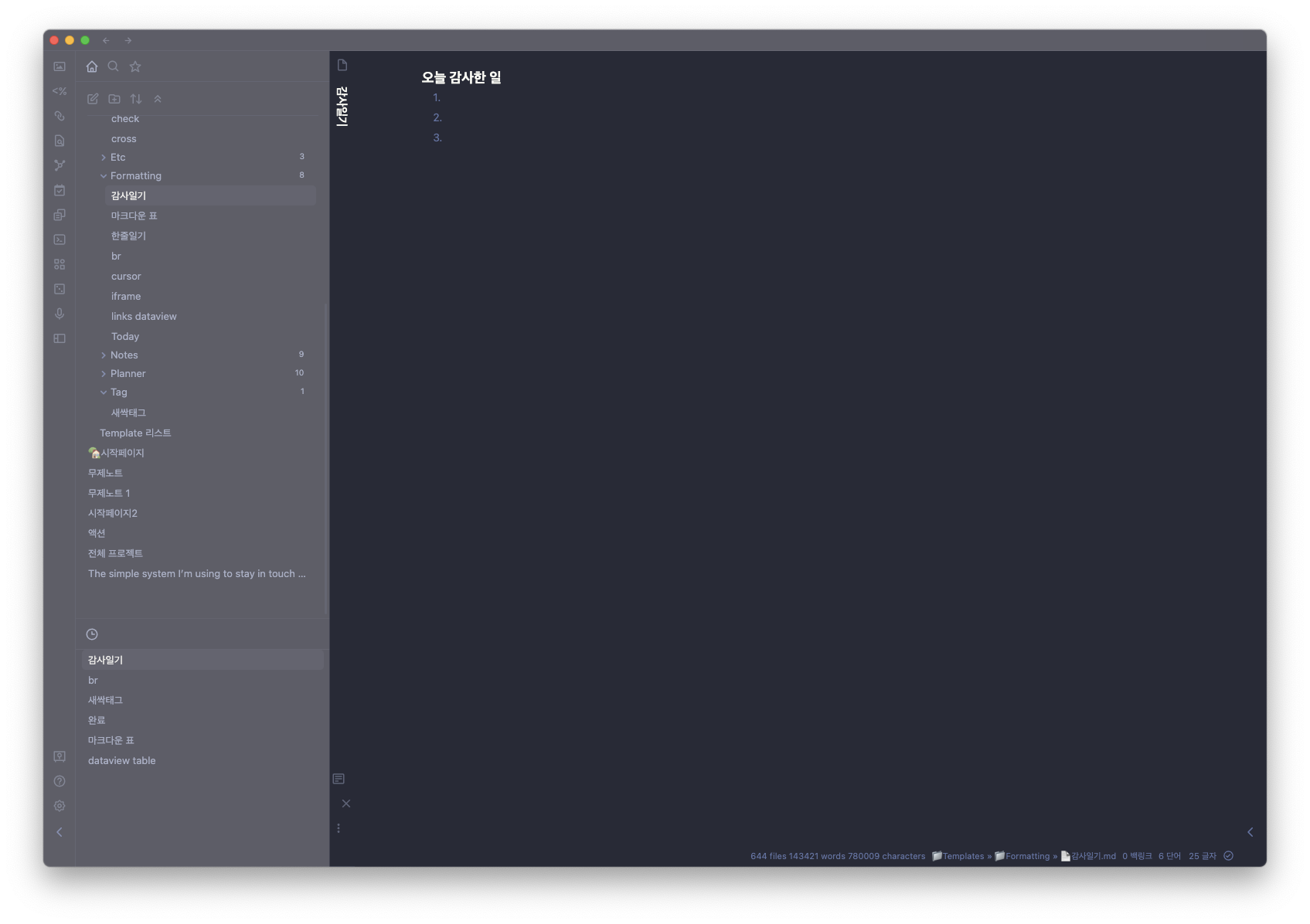 자주 쓰는 문구는 모두 템플릿 노트로 만들어두었습니다. 저는 일간 노트에 감사일기를 쓰는 경우도 있고 안 쓰는 경우도 있어서 아래와 같이 템플릿을 등록해두고 생각 날 때마다 불러와서 사용합니다. "감사일기" 라는 노트를 만들어 템플릿 폴더에 저장했습니다.