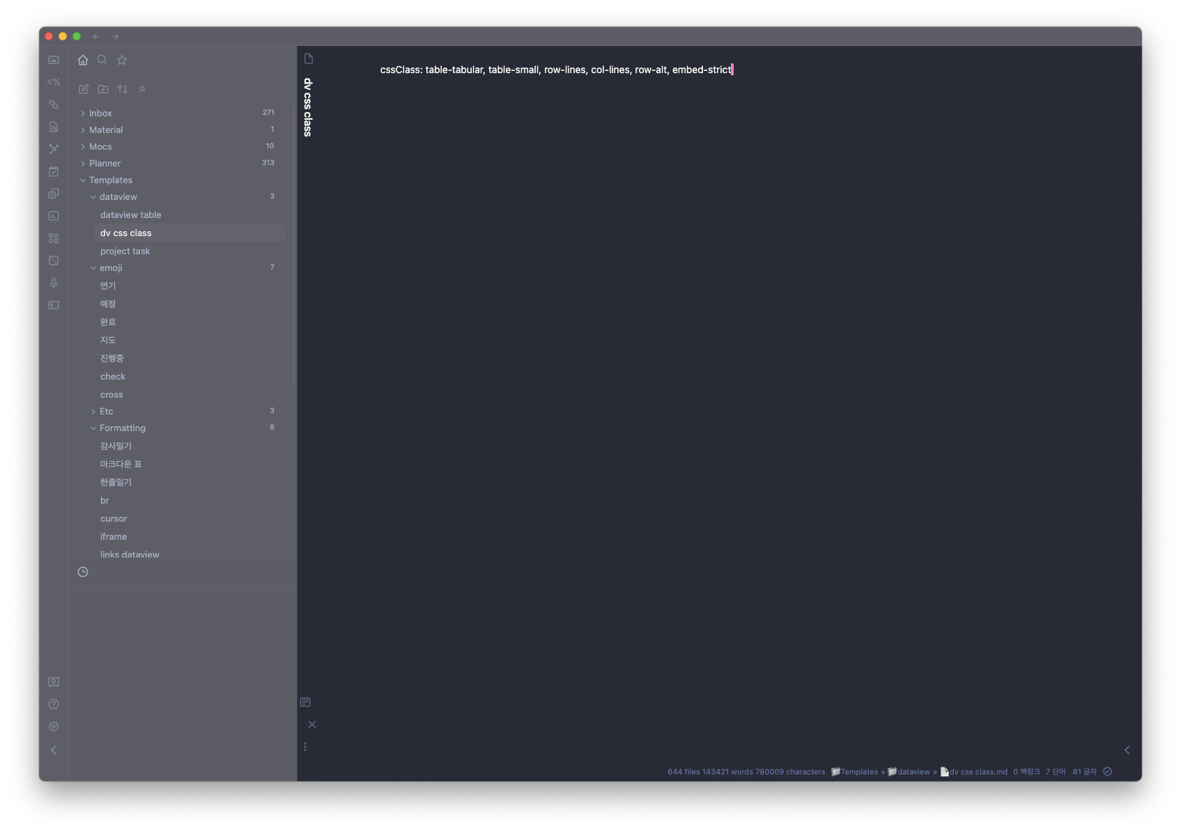 새로운 노트를 만들어서 프론트매터를 작성할 때 매번 작성하는 프론트매터가 있을 수 있습니다. 저 같은 경우는 Minimal Theme에서 지원하는 데이터뷰 전용 cssClass 프론트매터를 자주 사용합니다. "dataview css"라고 새로운 노트를 만들어 템플릿 전용 폴더에 저장합니다. 내용은 아래와 같습니다.