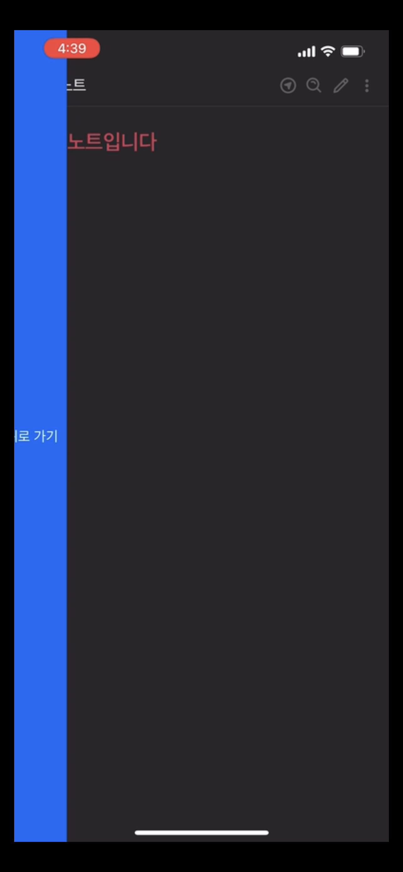 그래서 엄지손가락으로 휙 쓸어넘겨 뒤로가기를 하는데요. 옵시디언 앱에서 왼쪽에서 오른쪽으로 넘기면 아래 영상과 같이 왼쪽 사이드바가 나오게 됩니다.