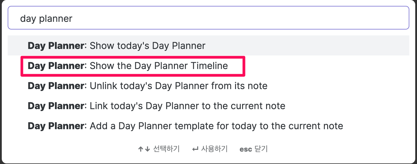 Day Planner에서 가장 핵심이 되는 기능입니다. 시간 계획을 사이드바에 타임라인으로 보는 것입니다. 일간노트에 시간 계획을 작성하고 Day Planner에 연결을 했다면 명령어 팔레트에서 "Day Planner: Show the Day Planner Timeline"을 선택합니다.