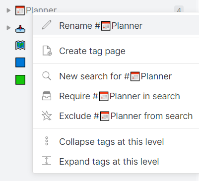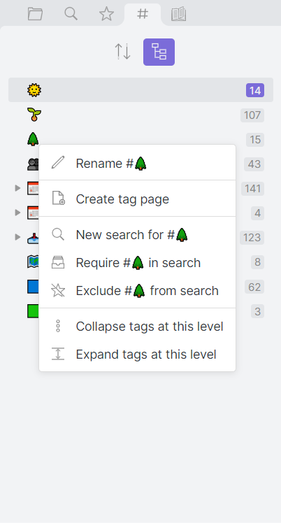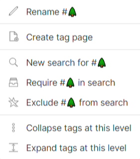 마우스를 이용해서 빠르게 태그 검색을 할 수 있습니다. 현재 검색 결과에 태그를 포함한 노트(tag:#whatever)를 찾거나 태그를 제외한 노트(-tag:#whatever)를 찾을 수 있습니다.