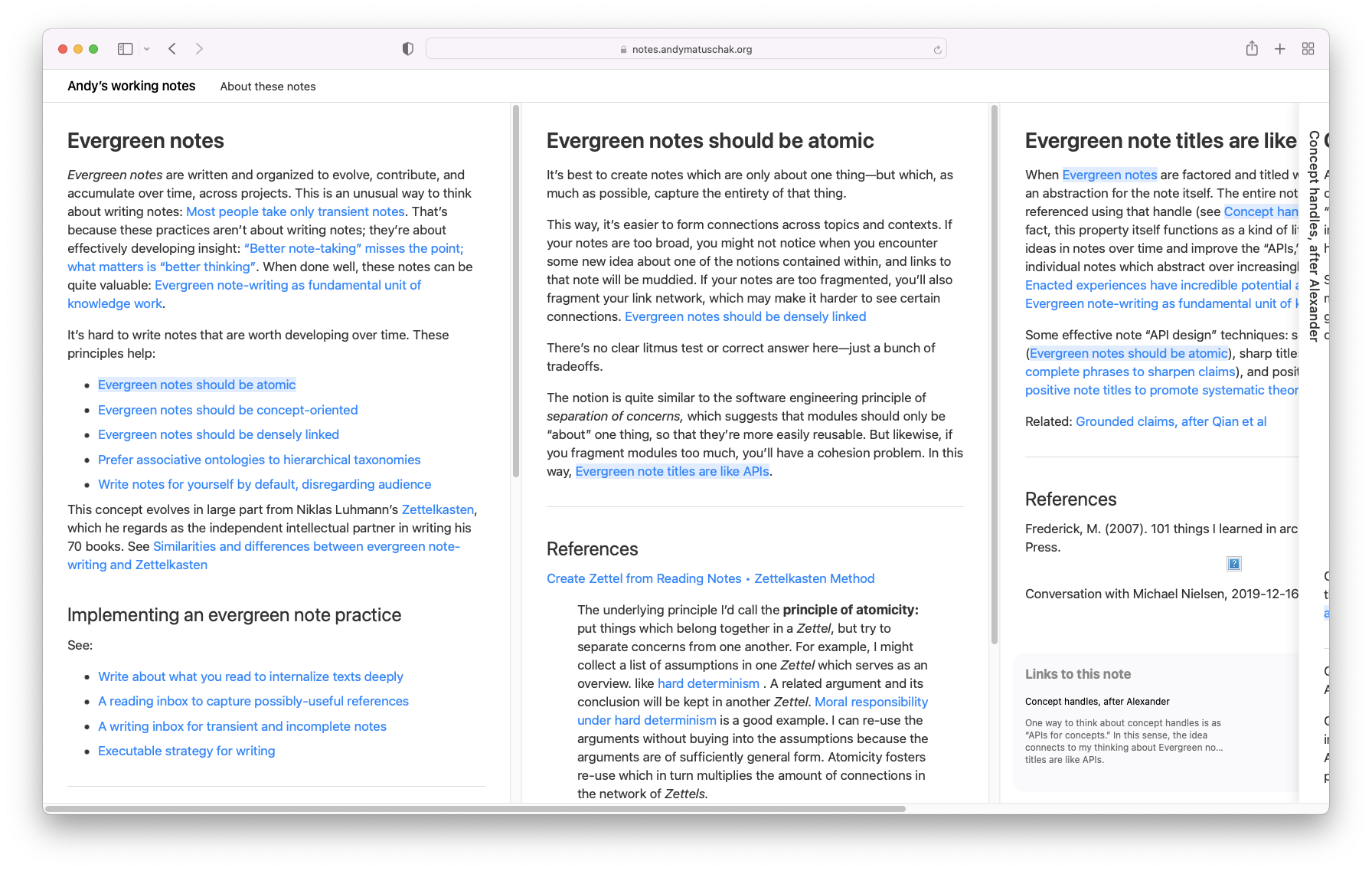 Sliding Panes(Andy's Mode) 플러그인은 옵시디언의 노트 패널을 마치 서류철에서 정리된 문서를 보듯이 수평 방향으로 노트를 넘겨가며 볼 수 있도록 하는 플러그인입니다. 뒤에 (Andy's Mode)라고 붙은 이유는 개발자가 에버그린노트를 소개한 Andy Matuschak의 홈페이지에서 따왔기 때문입니다.