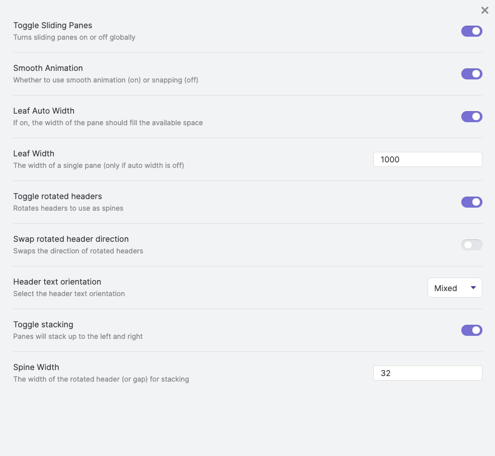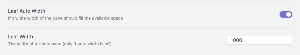 Leaf Width는 노트 패널의 일정한 좌우 크기를 의미합니다. 기본 세팅으로는 700으로 되어있습니다. 이 크기를 변경하면 슬라이딩 및 쌓기 기능에 영향을 미칩니다.