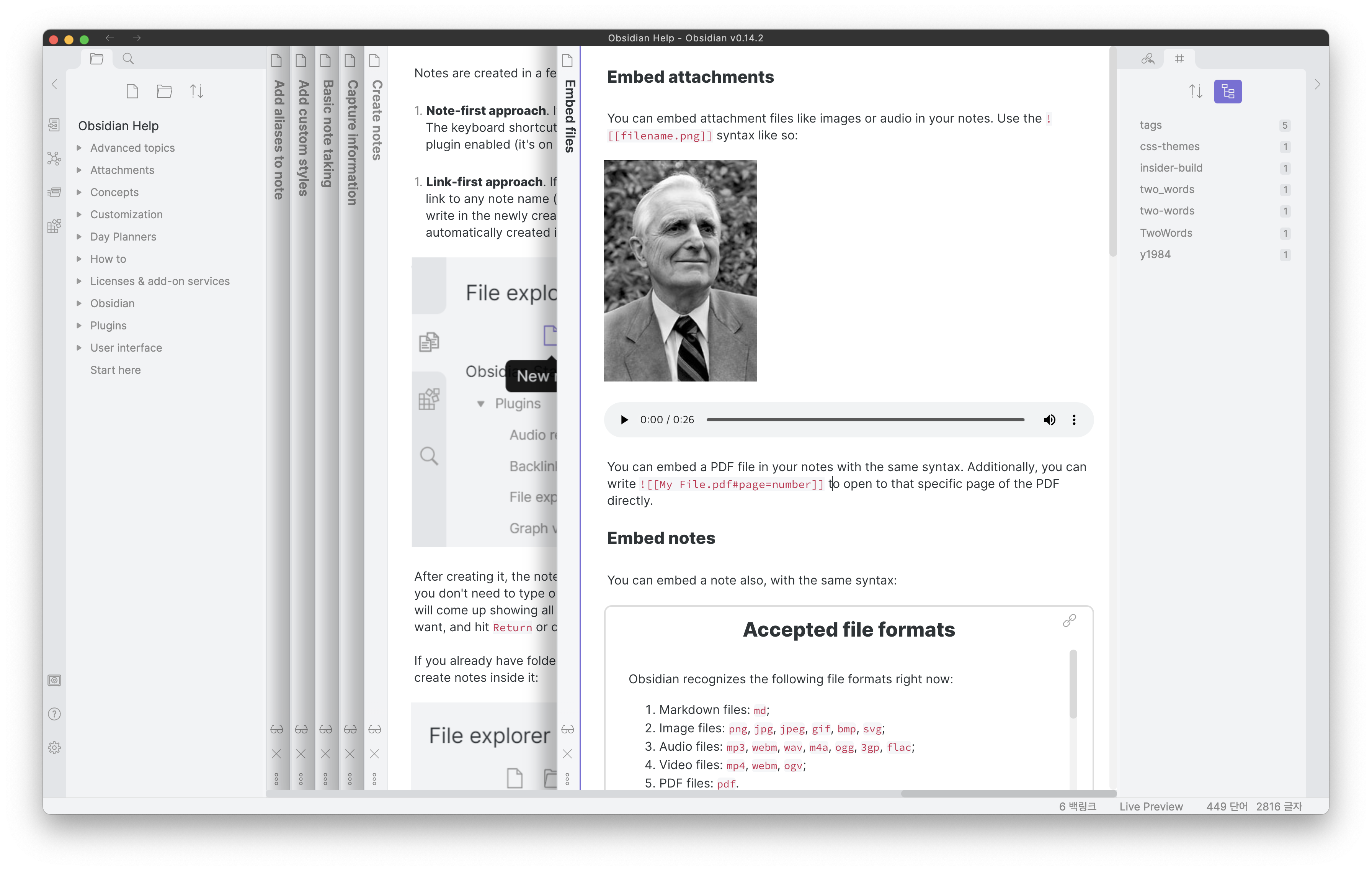 여러개의 노트 패널을 열었을 때 포스터처럼 쭉 붙어있다면 어떤 노트패널이 열려있는 지 확인하기 어렵습니다. 이 때 노트 패널 쌓기(Stacking) 기능을 사용하면 위의 사진 처럼 활성된 노트를 가운데에 두고 나머지 노트들은 마치 서류철에 정리된 것처럼 접어놓을 수 있습니다. 활성화를 추천합니다.