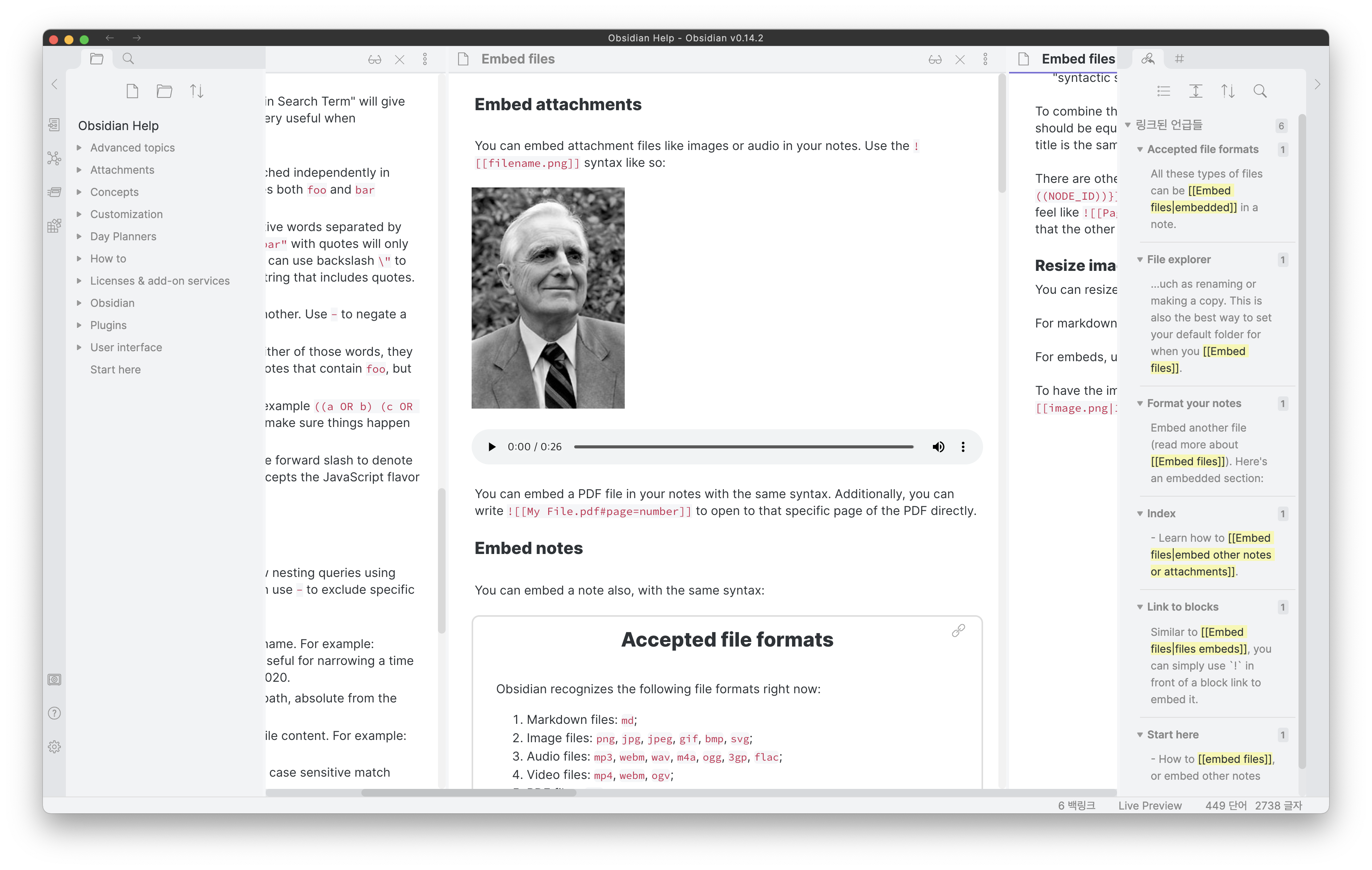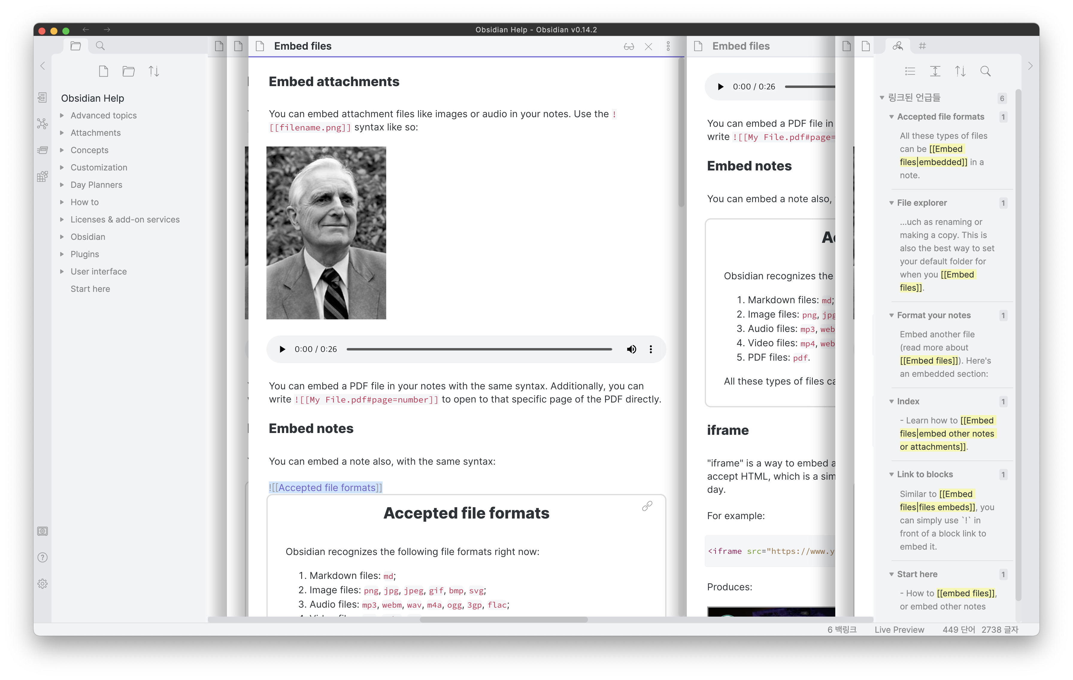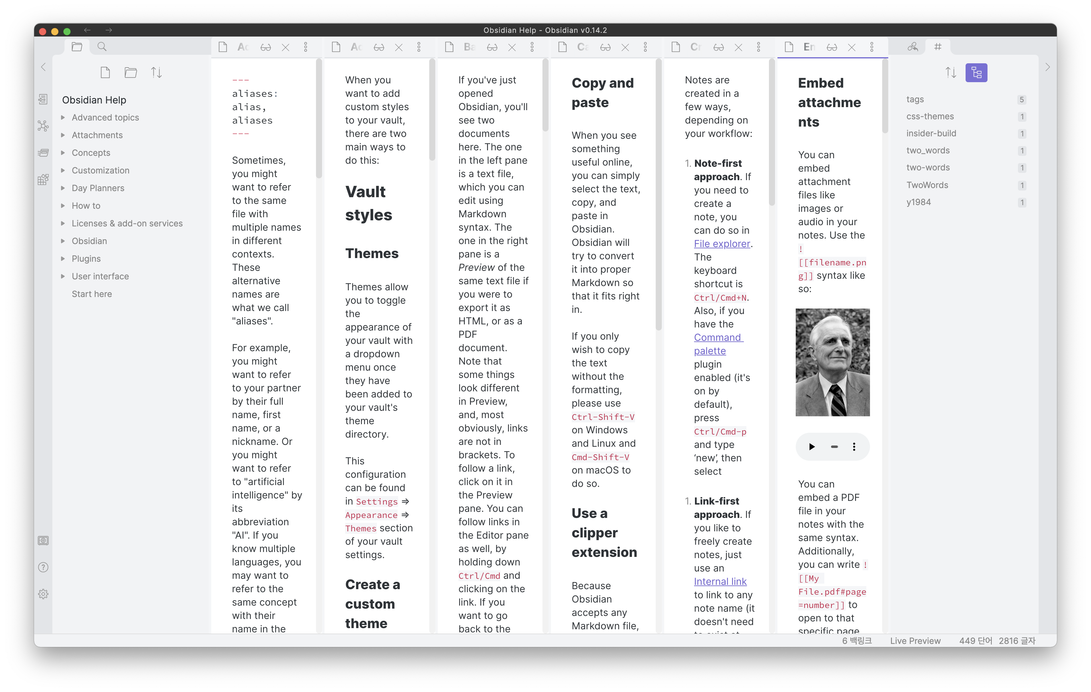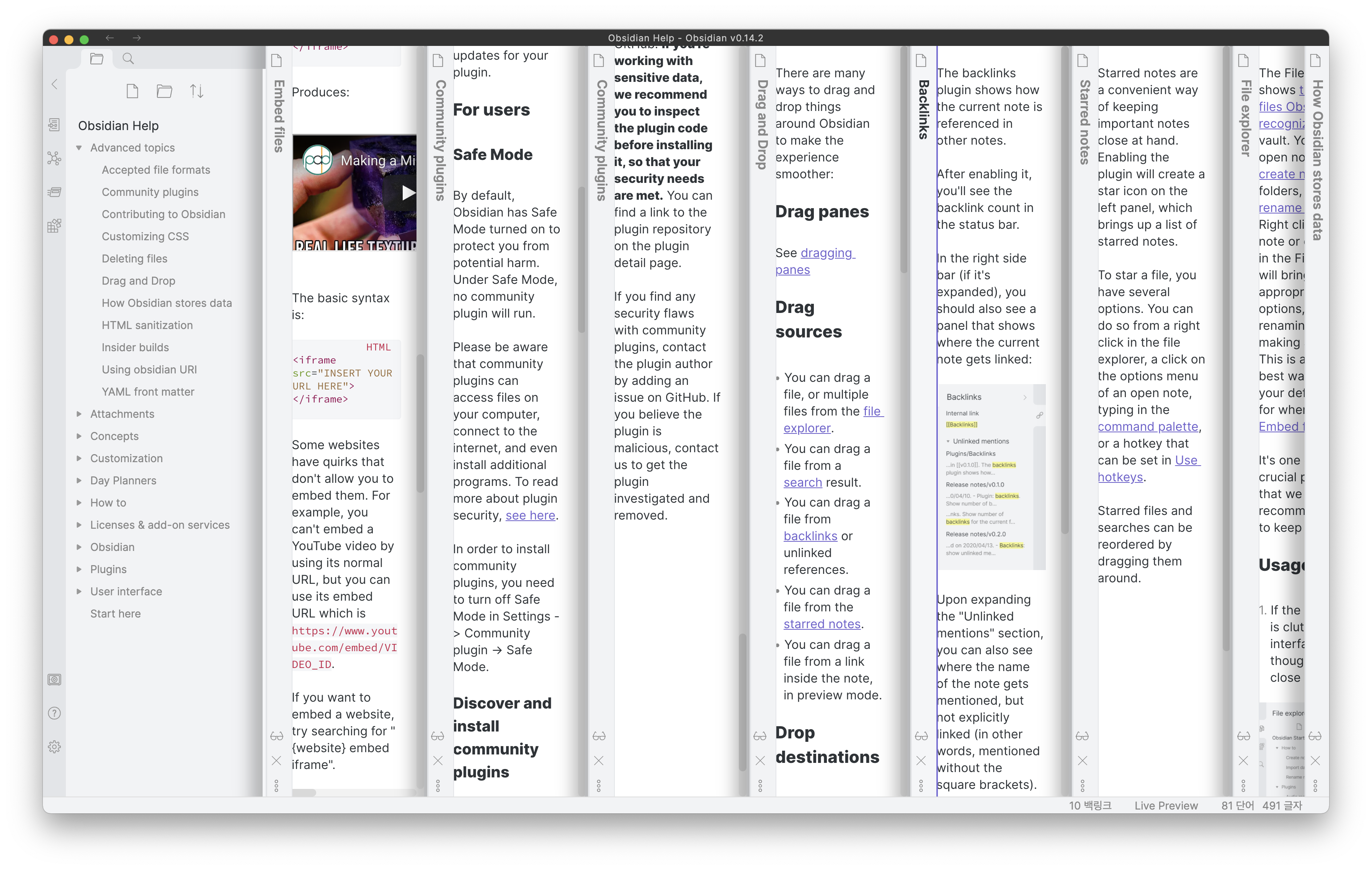 Sliding Panes 플러그인을 사용하지 않고 새로운 노트를 열게 되면 노트 패널의 좌우 크기가 좁혀지며 열리게 됩니다. 이는 좌우 사이드바를 제외한 메인 영역을 나눠서 쓰기 때문입니다. 여러 개의 노트를 열고 작업을 하는 경우에 매우 불편하며 따라서 불가피하게 2개 또는 3개의 패널을 열고 작업을 할 수 밖에 없습니다.