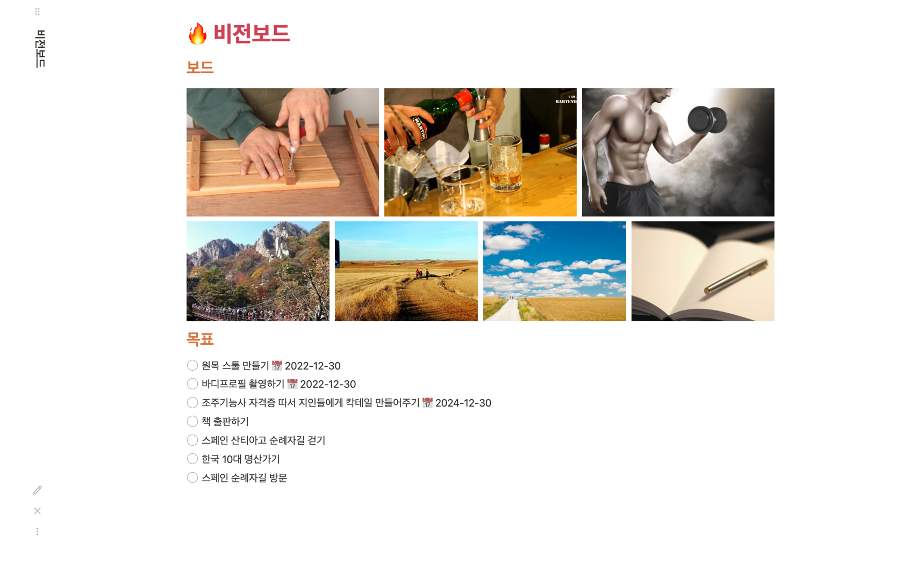 비전보드는 자신이 원하는 꿈이나 목표를 구체화하기 위한 도구 중 하나입니다. 목표와 관련된 동기를 부여하는 사진과 문구들을 화이트보드나 액자 등으로 만들어 눈에 잘 보이는 곳에 두는 것입니다. 아날로그 방식이 아닌 디지털 방식으로 비전보드를 만들어보면 어떨까요? 옵시디언으로 비전보드 노트를 만들고 즐겨찾기나 일간노트 템플릿에 링크를 걸어 매일 본다면 디지털로도 충분한 그 효과를 누릴 수 있을 것입니다.