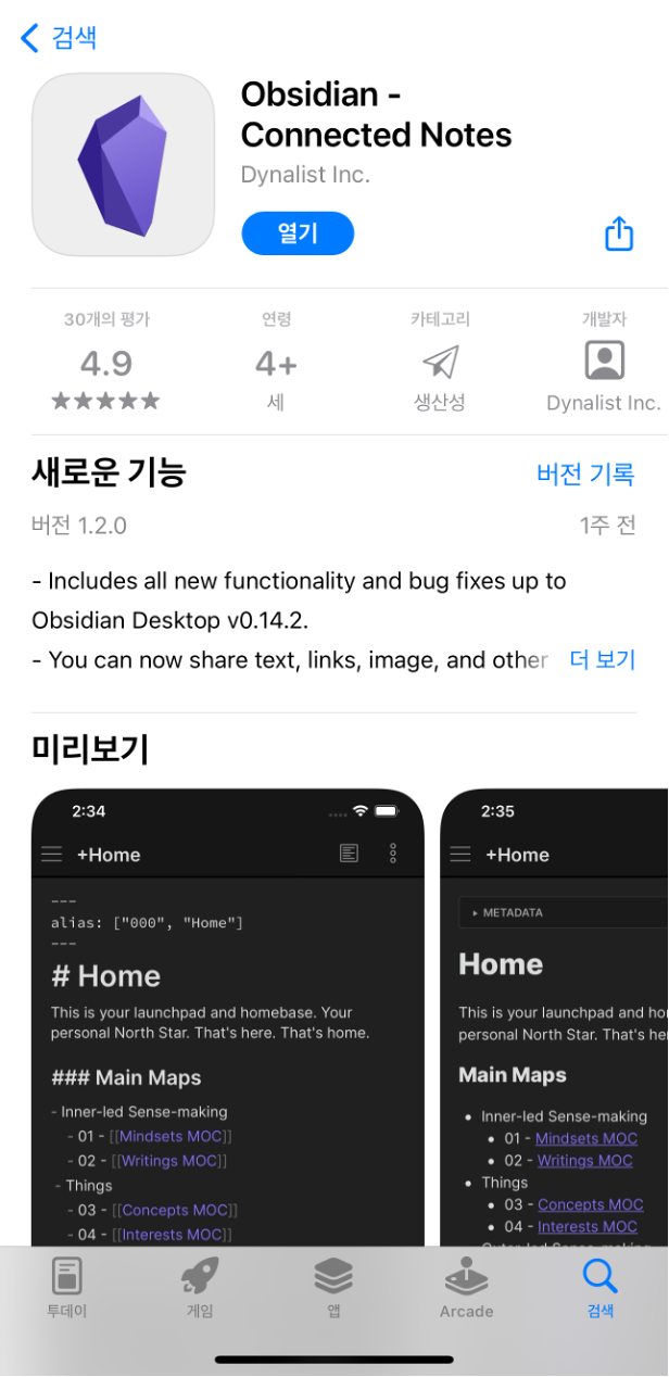 옵시디언은 PC는 Window와 Mac, Linux 버전이 있고 모바일에서도 Android와 iOS를 지원합니다. PC는 옵시디언 공식 홈페이지에서 설치 파일을 다운로드 하여 설치할 수 있고 모바일은 플레이스토어와 앱스토어에서 앱을 설치할 수 있습니다.