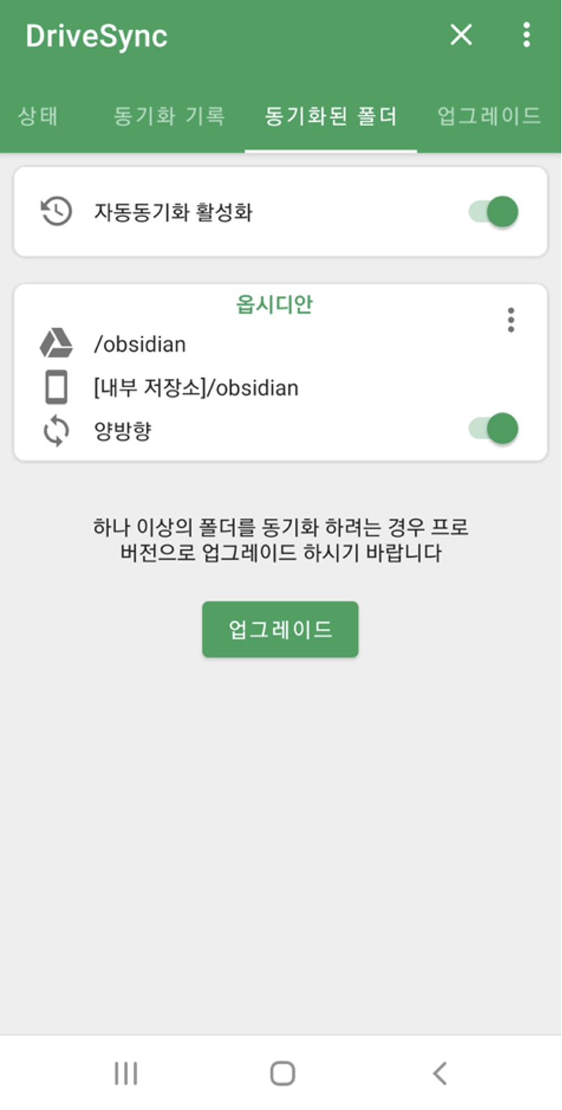 안드로이드에서는 Autosync for Google Drive라는 어플을 이용해서 동기화를 할 수 있습니다. 이 어플은 모바일의 내부 저장소의 폴더와 구글 드라이브 상의 폴더 하나를 주기적으로 동기화해주는 앱입니다. 구글 드라이브 앱이 있다고 해서 옵시디안 앱이 구글 드라이브 앱을 이용해서 파일들을 읽고 쓸 수 있는 것이 아니기 때문에 내부 저장소와 클라우드를 연결하는 방식의 Autosync 앱이 필요합니다.