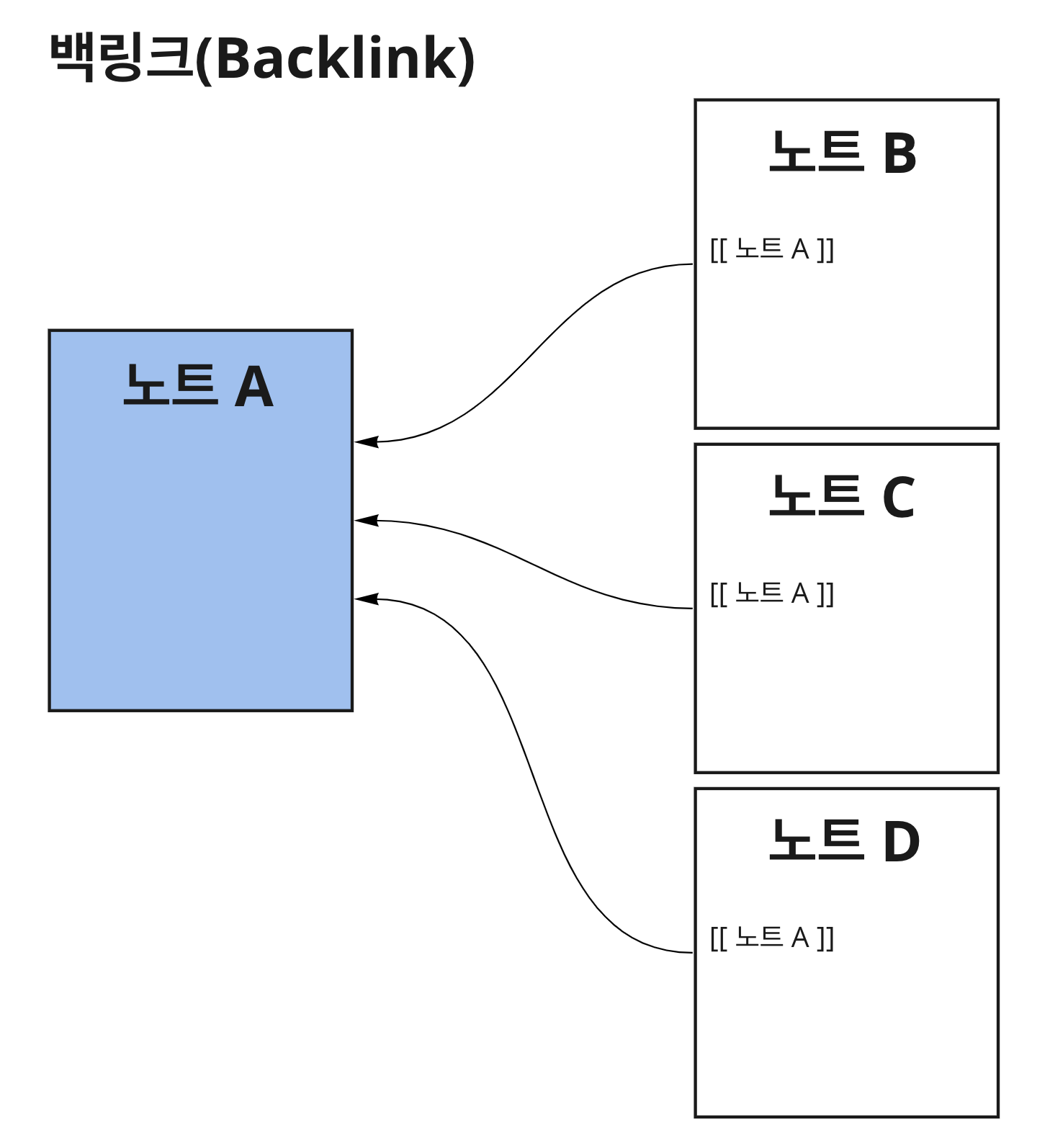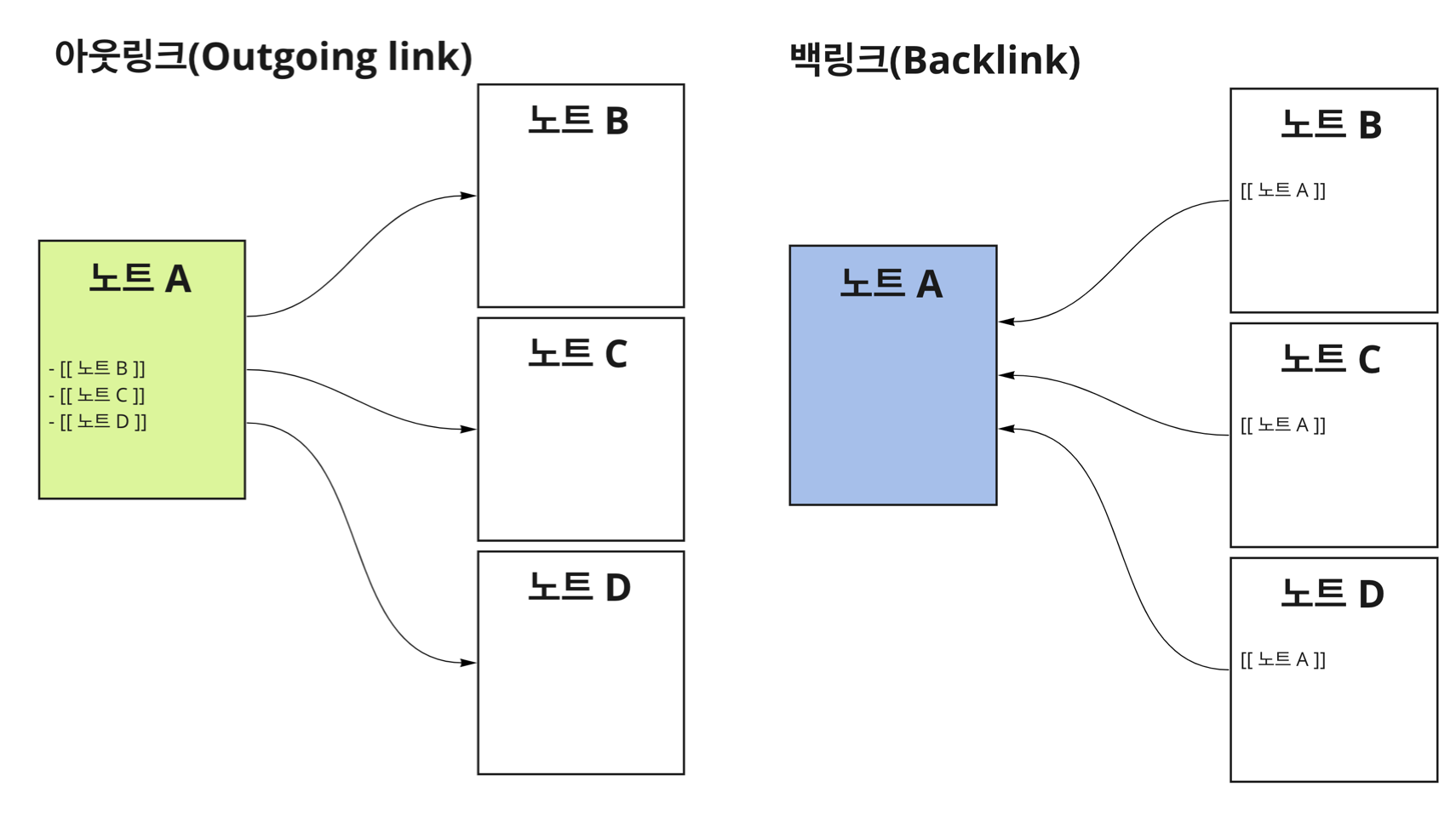 아래 그림은 노트 A에 대한 아웃링크와 백링크를 나타내는 그림입니다. 내부 링크를 어디서 하냐에 따라서 달라집니다.