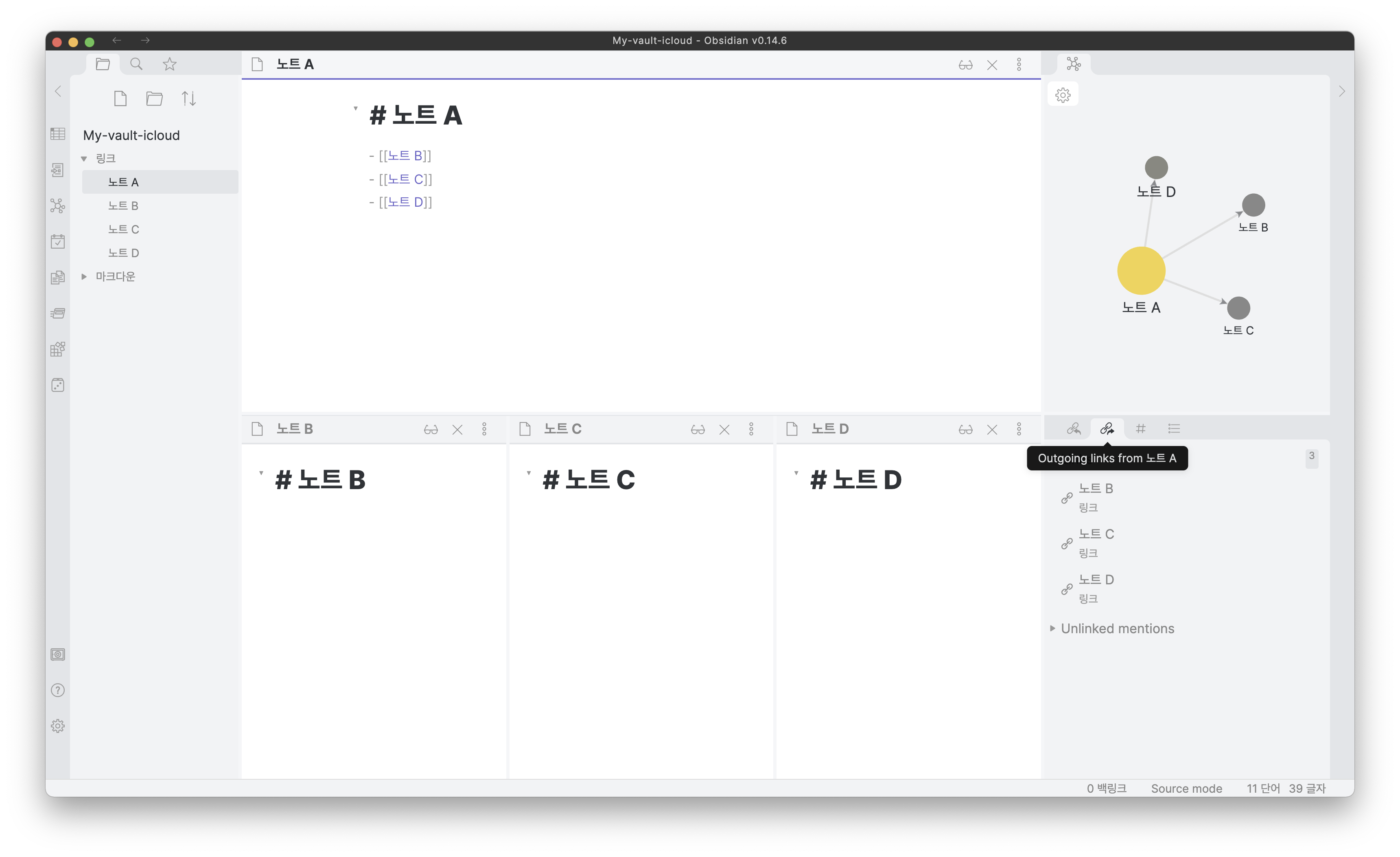 현재 활성화된 노트"가" 참조하고 있는 노트를 뜻합니다. 아래 캡쳐된 화면에서 보면 노트 A는 노트 B, 노트 C, 노트 D를 연결하였습니다. 그래프뷰에서 보이는 것 처럼 이 4개의 노트는 A를 중심으로 연결이 되어 있습니다. 오른쪽 아래의 아웃링크 패널에서는 노트 A가 참조하고 있는 노트들의 목록을 확인할 수 있습니다. 예상한대로 노트 B, 노트 C, 노트 D를 확인할 수 있습니다.