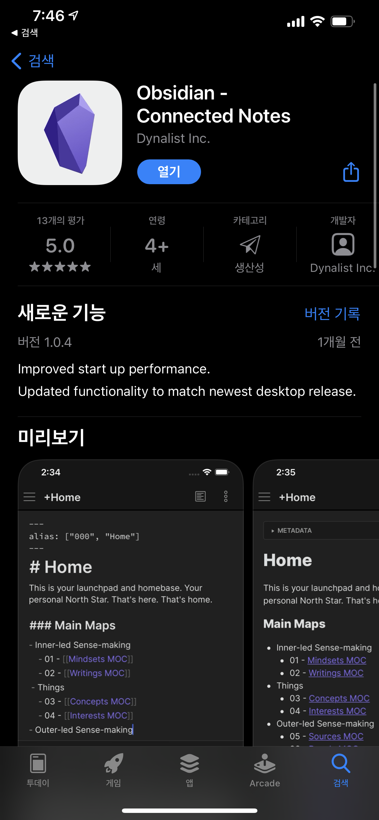 - App Store에서 Obsidian을 검색하고 설치합니다.