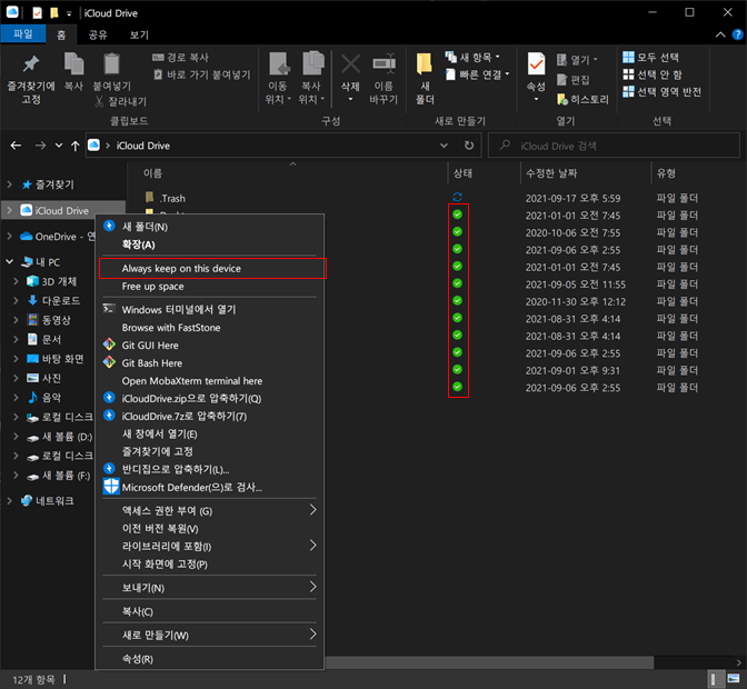 탐색기 - iCloud 드라이브 오른쪽 버튼 클릭 - Always keep on this device 클릭